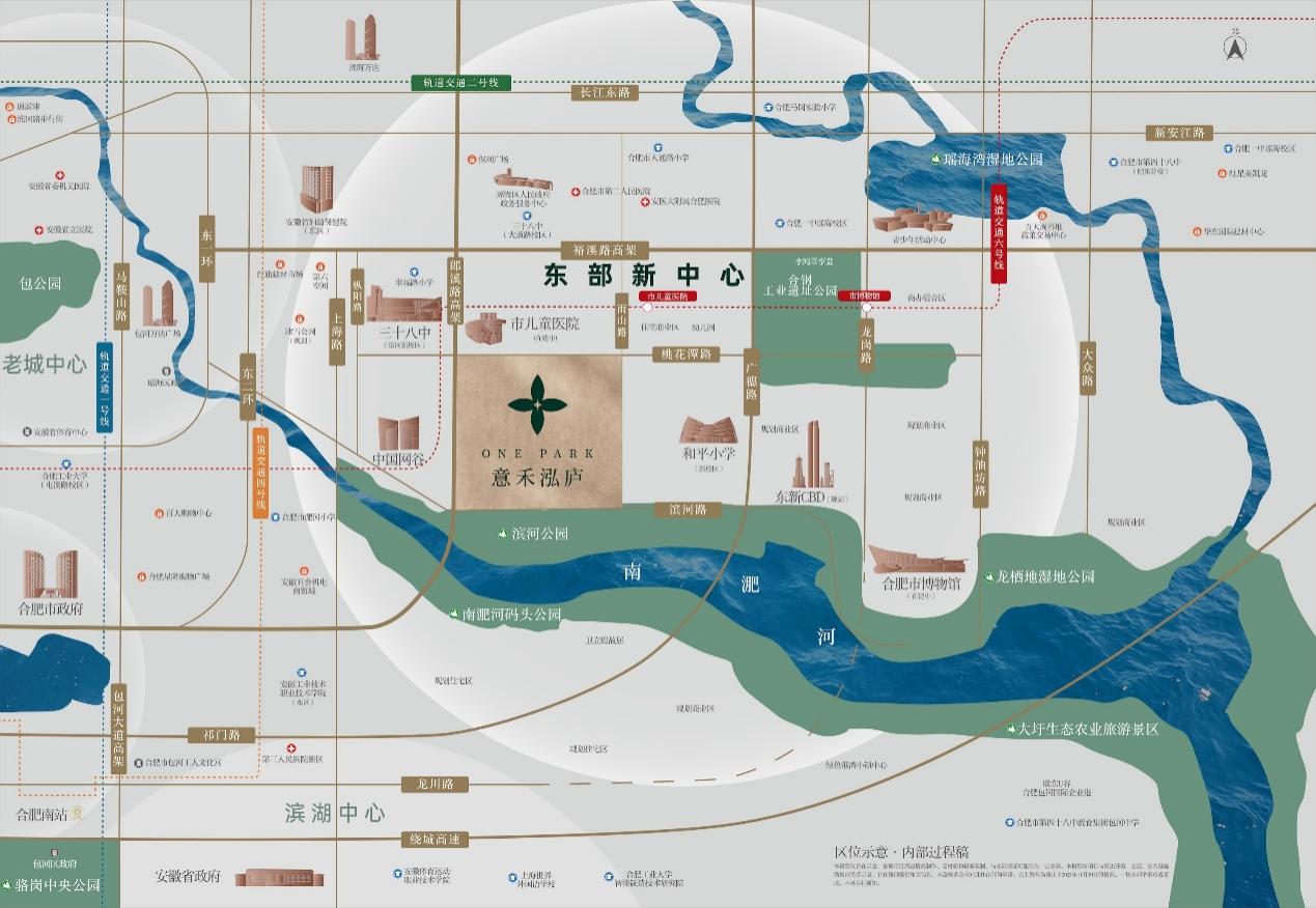 项目南边一路之隔就是南淝河,属于真正的景观房,同时距离地铁6号线市儿童医院站也非常近,路网辐射全城、生态资源充沛;自身配建的商业+东新壹号配建商业、招生的和平小学新校+三十八中学新校则可以满足业主的商业、教育需求。