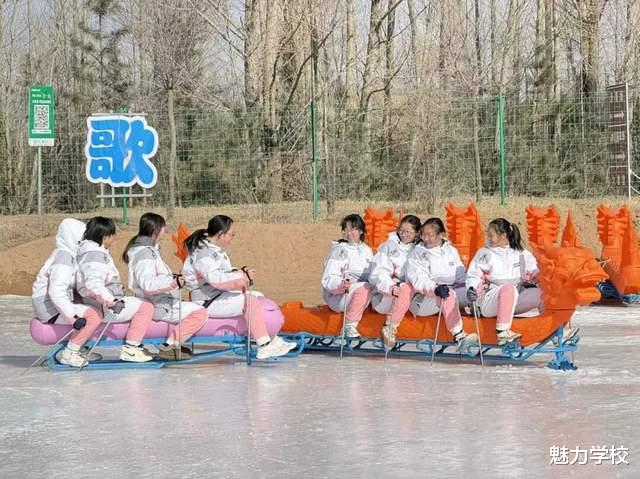 同学们分组组队,手抓龙舟扶手,脚踩冰面协同发力,喊着整齐的口号奋力前行,冰面上的龙舟时而加速、时而追赶,欢声笑语伴随着冰面摩擦的声响,氛围感拉满。