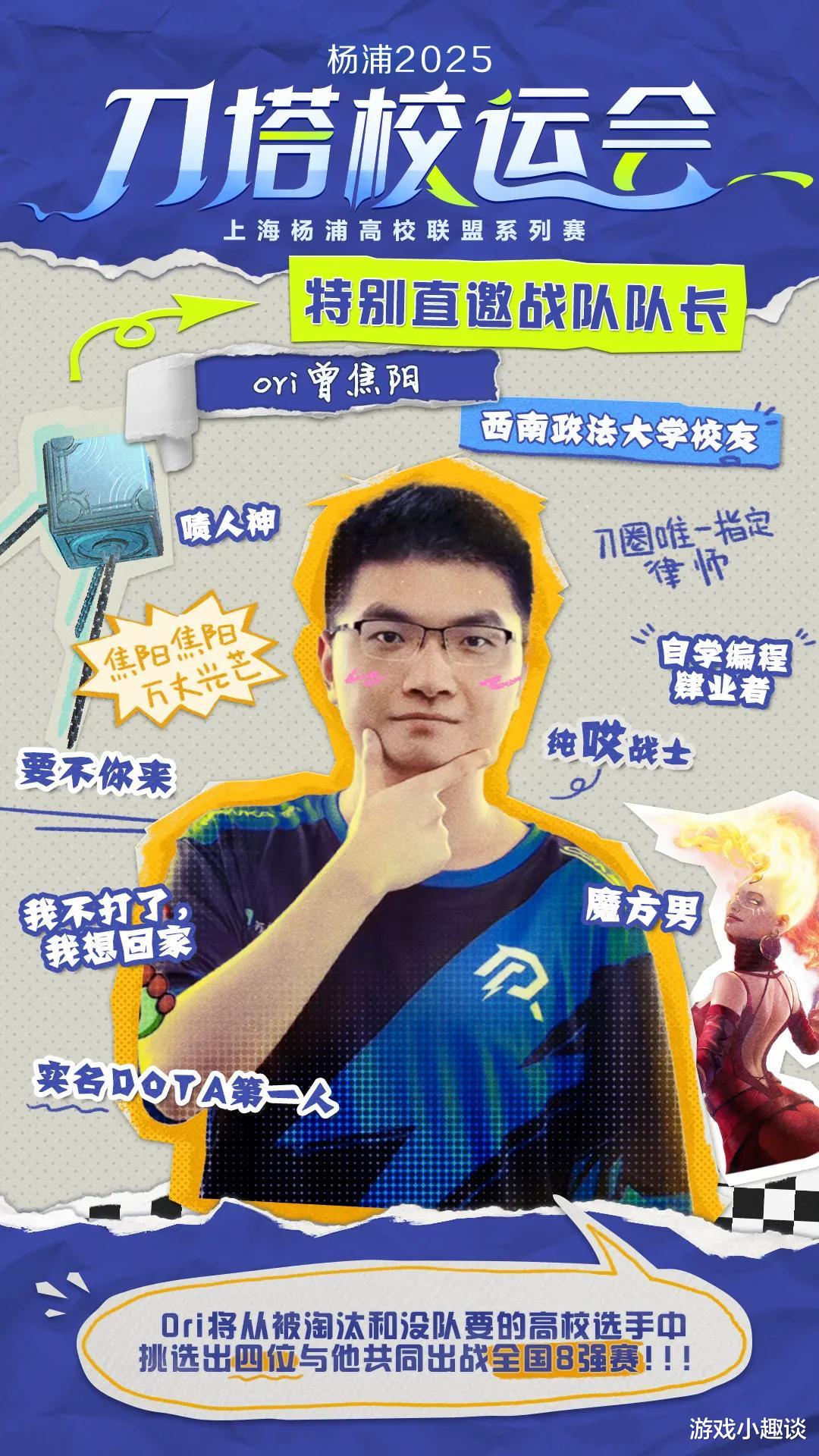 DOTA2校运会八强赛将于5月3日-5月4日开战,由四支海选出线战队以及四支直邀队伍分别展开双败淘汰对决,决出最终的三支战队前往线下争取全国冠军。而在昨天,八强的最后一支直邀战队也公布了名单,将由前职业知名选手“曾焦阳”Ori率队,与其他5名来自不同高校的队员组成“焦阳人类科学院战队”来突破八强参与全国冠军的争夺战。