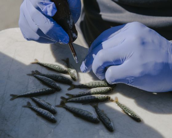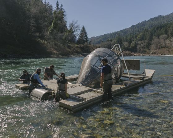 作为部落渔业计划的一部分,部落成员和生物学家安装旋转螺钉陷阱,用于捕获活鱼以监测疾病和跟踪迁移模式的专用设备