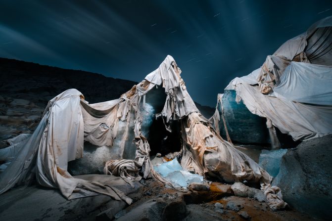 《冰兽的尸体》,作者在瑞士的罗纳冰川上放置了热反射毯,以减缓其融化,但今天这些覆盖物挂在破烂中。这是“对人类努力的致敬,也是对其局限性的清醒提醒。尽管有少数人的奉献精神,但他们的干预无法阻止冰川的退缩。