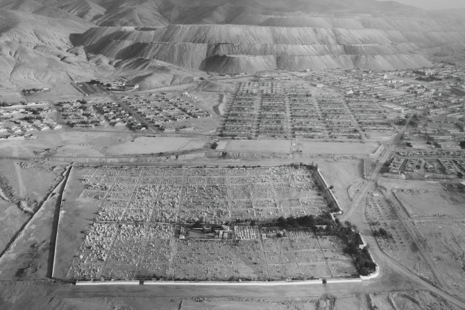矿石开采侵占了一个废弃的采矿城镇和墓地。该遗址的广阔,月亮的景观是无尽的灰色,该墓地正逐渐被不断扩大的矿石开采所包围。