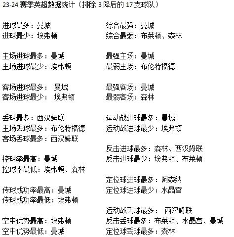 23-24赛季英超数据统计(排除三支降班马后的17支球队)