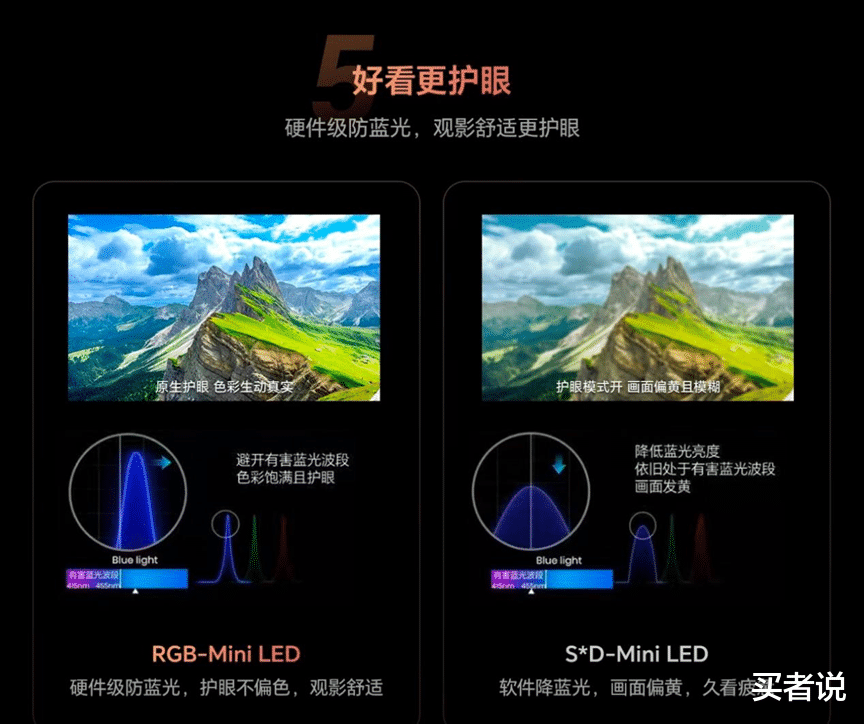 所以,RGB-MiniLED可以从源头切断有害蓝光,既不用降低蓝光亮度,也不会让画面发黄,做到了护眼不偏色,观影再久也舒适。