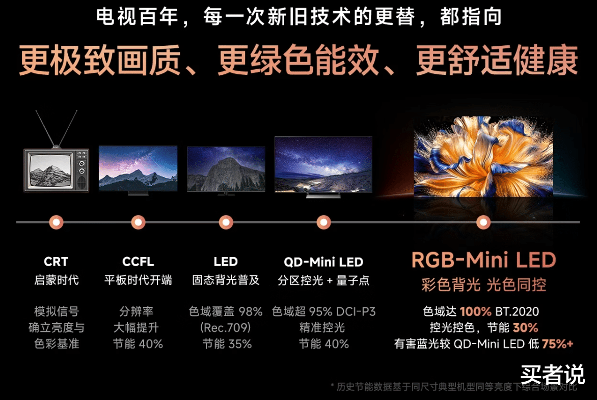反观RGB-MiniLED这边,从技术底层重构了MiniLED的发光逻辑,实现了高亮不偏色、硬件级防蓝光、低能耗长寿命、广视角优体验的全面突破。