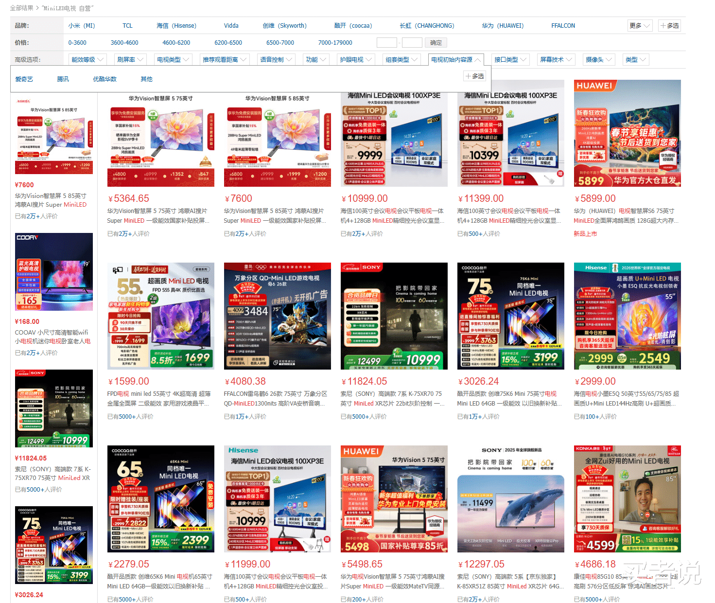 在京东以MiniLED电视为关键词,搜索到的结果,品牌众多,价格差距明显。