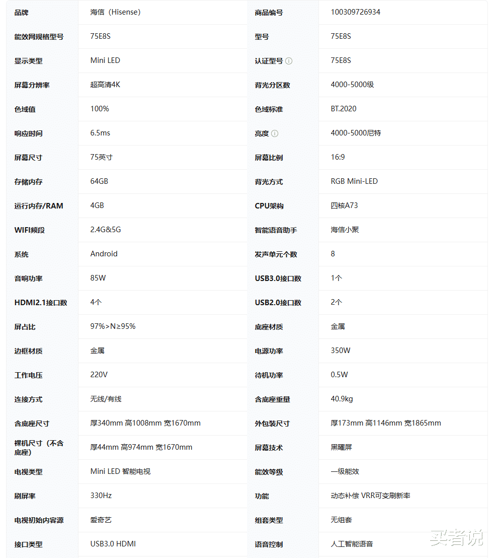 直接给出产品参数,可以看到,海信E8S在旗舰的定位下,给出的技术参数也基本全部拉满,总结技术亮点如下: