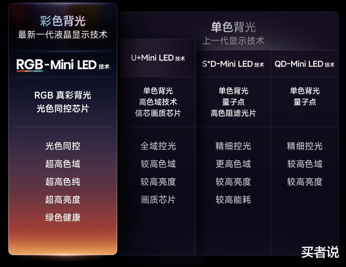 1.核心显示技术:采用RGB-MiniLED背光,搭配黑曜屏,从光源层面实现三原色直出,画质纯净。