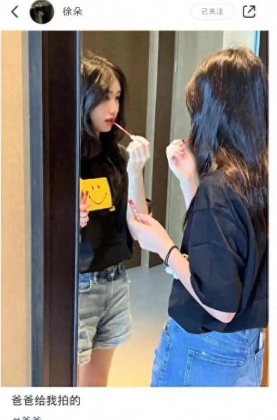 今年的七月底,徐朵就在社交平台上分享了一张自己对镜涂口红的照片。