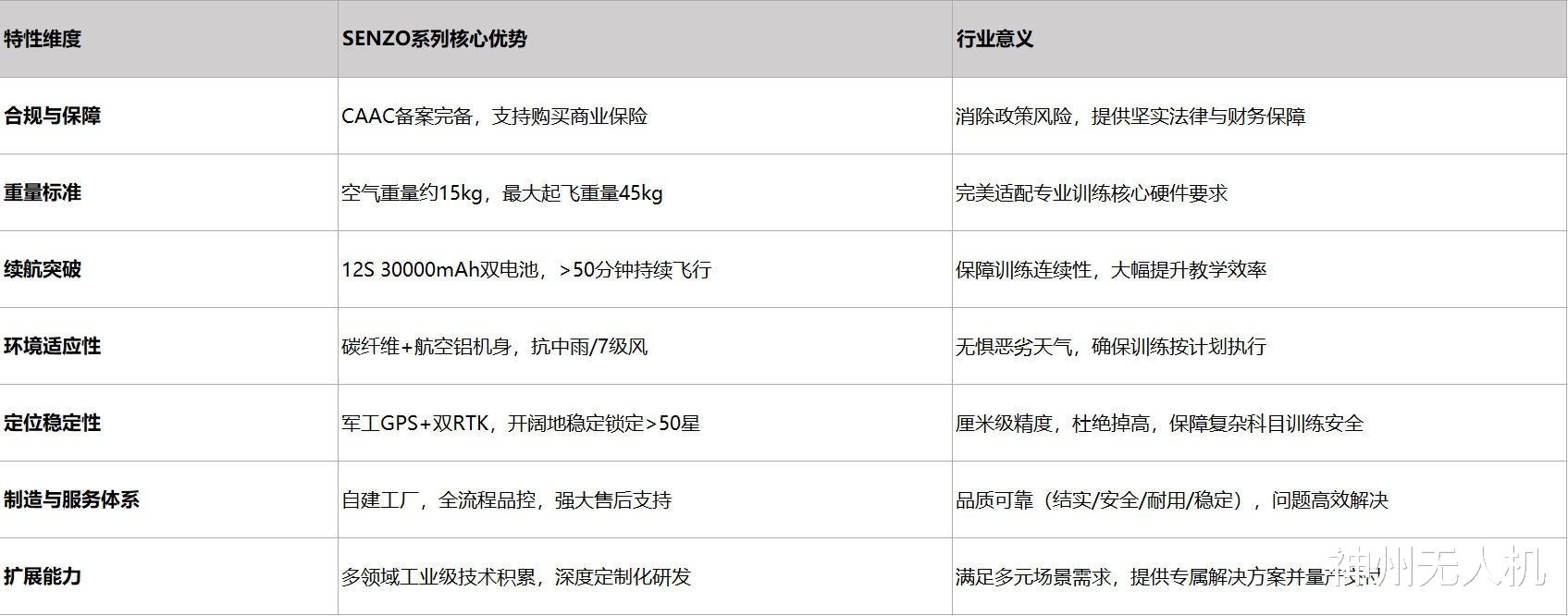 神州无人机凭借SENZO系列飞行训练设备,直击行业在合规性、续航力、环境适应性、稳定性以及服务保障上的核心痛点。其CAAC备案与商业险支持构建了坚实的信任基础;超长续航、坚固机身、顶级抗风抗雨能力和军工级精准定位技术,则提供了无与伦比的训练体验与安全保障。这一切的根基,正是神州自建工厂所带来的全链路质量把控能力、持续创新实力和面向未来的深度定制化服务潜力。