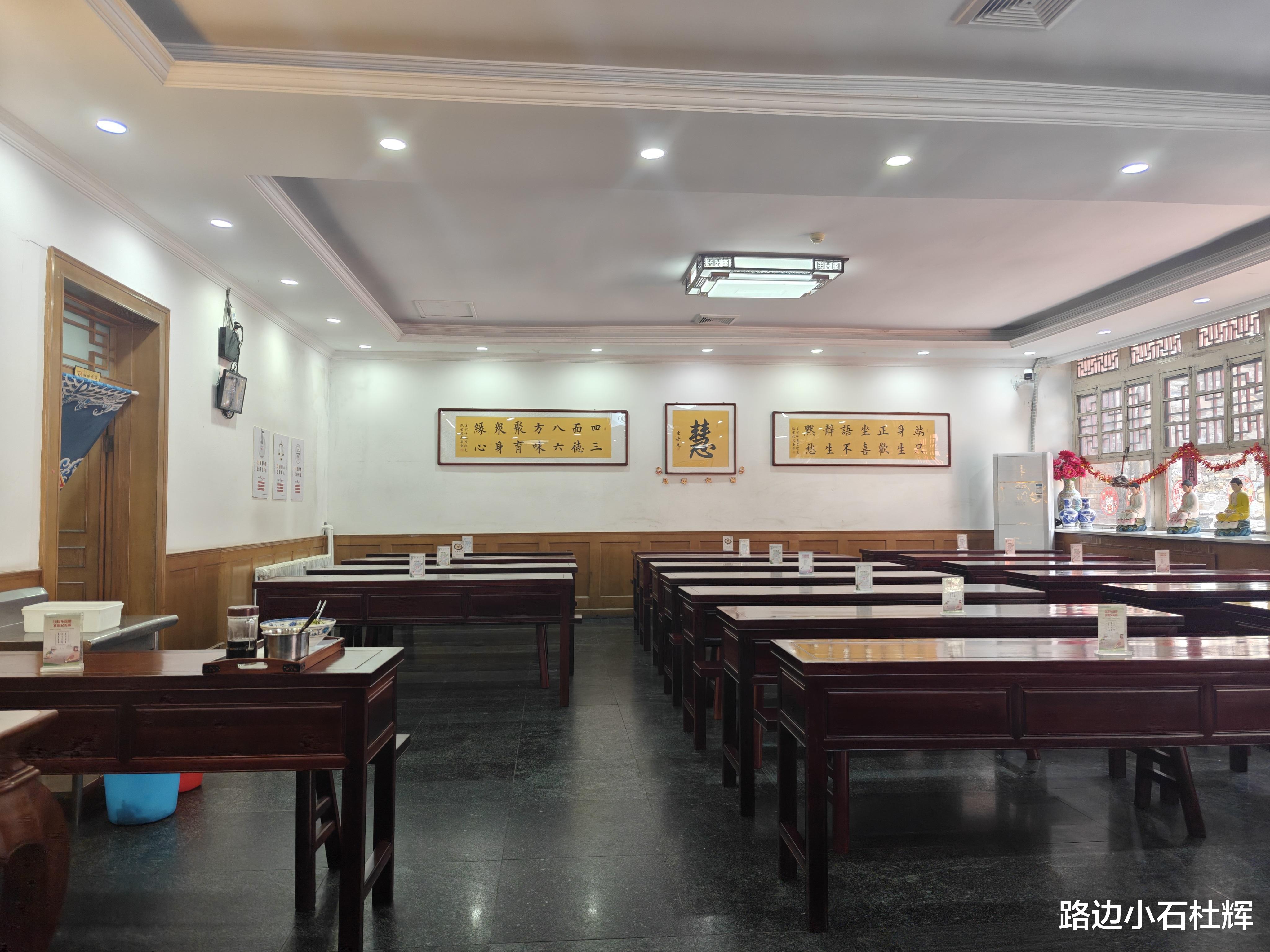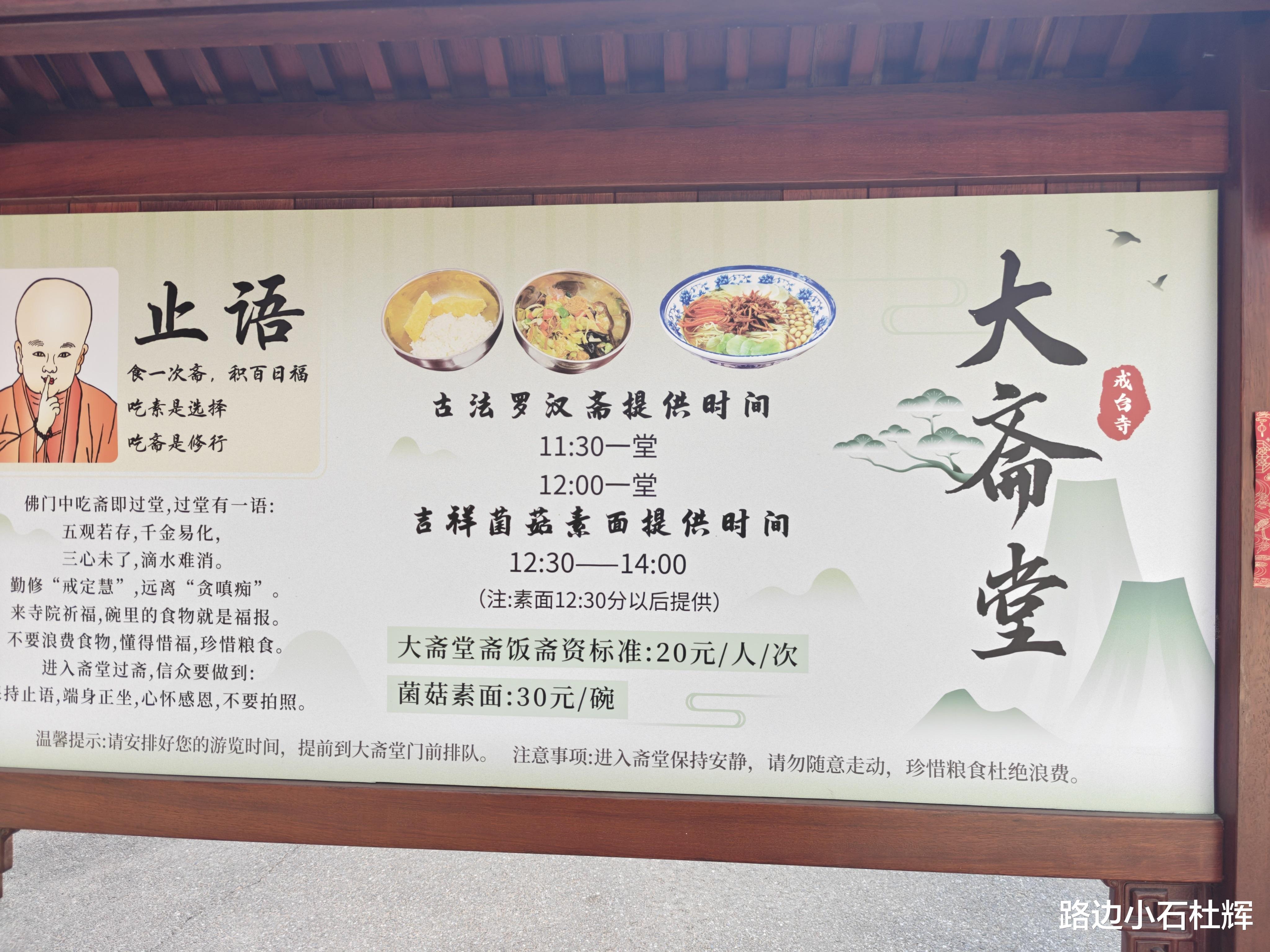 寺内有大斋堂供应素斋午餐。斋堂11点半、12点供应两堂素斋,一人20元。12点半后供应素面,一人30元。斋堂除供应午餐外,还有炸咯吱等小吃可购买外带。斋堂在门外排队进入,扫码付款,堂内止语。素面一大碗约有二三两面,成人正好吃饱。面筋道汤鲜爽,配菜丰富,口味还是不错的。