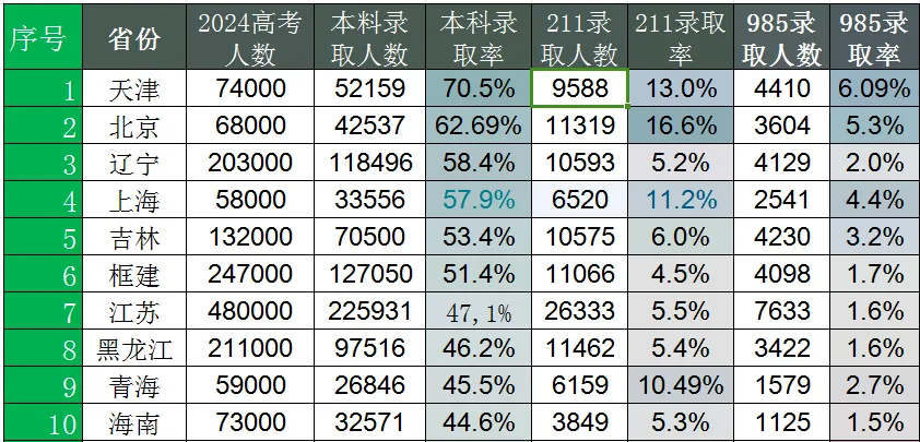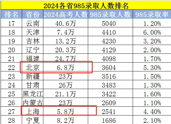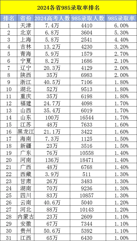 根据2024年的数据,天津高考参加高考的总人数约为7.08万人,相比其他省份,这个数字算是很小的了。而各地985名校对天津的招生计划人数又异常的多,今年985在天津的招生人数达到4410人,985/211的总录取名额达到9588名。也就是说在天津7万余考上中,有接近一万名学生要考上985/211。另外,天津今年的本科录取率也是高的不得了,70.5%,也就是说十个考生中有七个人就能上本科,这不得不让他省人员羡慕。如此高的数据自然成就了天津高考的天堂模式。北京上海紧随其后紧随其后的是北京和上海,985录取率分别为5.30%和4.40%。作为经济发达的一线城市,北京的高考生人数为6.8万,上海有5.8万的考生。二者的高考录取人数都排在15名开外,在高考考生人数中不算高,但在录取上那可不是简单的高。