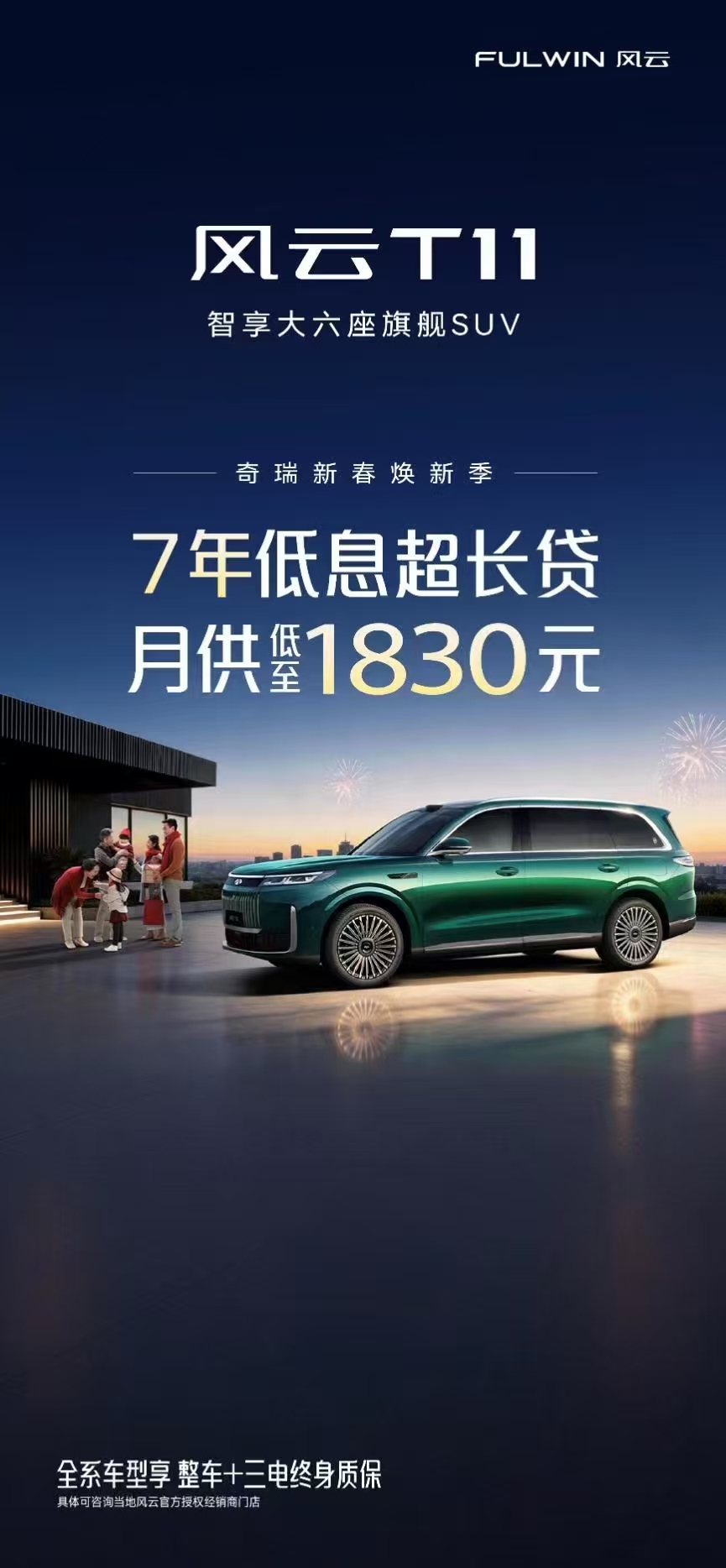 春节刚过,不少家庭正盘算着新年第一笔大件消费——换辆新车。尤其对于多孩家庭或三代同堂的用户来说,一辆空间大、配置高、安全性强的SUV成了刚需。而就在这个节点,奇瑞汽车推出“7年低息超长贷款,风云0压购新车”活动,其中风云T11限时月供低至1830元!这意味着,每天不到60块钱,就能开走一台定位“智享大六座旗舰SUV”的风云T11。