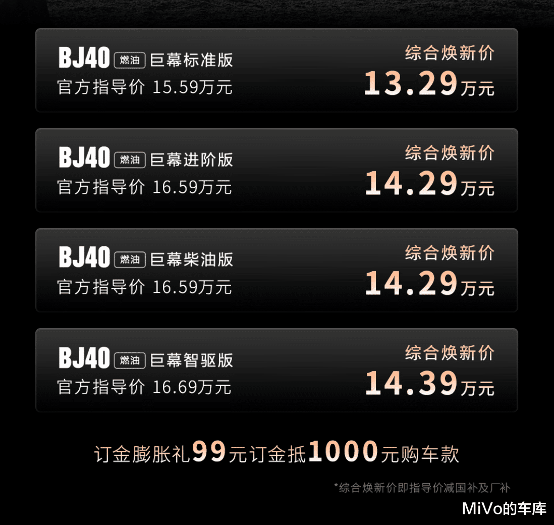 北京越野BJ40燃油巨幕版官方指导价15.59—16.69万元,综合焕新价低至13.29万元。北京越野送上订金膨胀礼:1月27日下订,即可享受“99元订金抵1000元购车款”优惠政策。