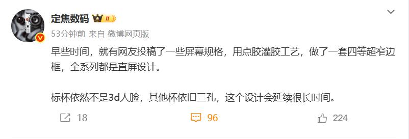 其他三款机型依然会是屏幕三打孔设计,支持3D人脸识别解锁。