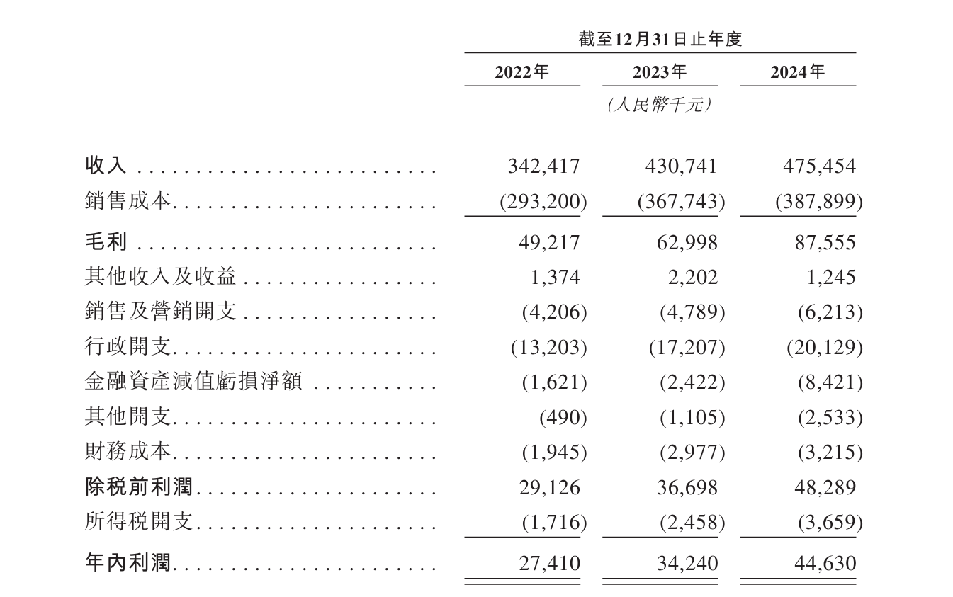 业绩方面,2022年—2024年(下称“报告期”),奥联服务分别实现营业收入3.42亿元、4.31亿元、4.75亿元,年内利润2741万元、3424万元、4463万元。报告期各期,公司约40.6%、40.5%、40.4%的收入来自广东省。