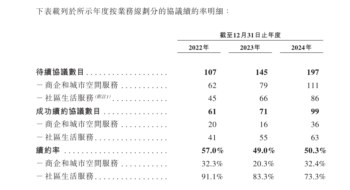 值得注意的是,奥联服务社区生活服务续约率下滑明显,报告期各期分别为91.1%、83.3%、73.3%。对此,公司解释称,若干客户不再续签并非由于公司服务质素或与客户有任何意见分歧所致。同时,公司退出若干项目,并将资源投放至规模更大或盈利更高的项目。