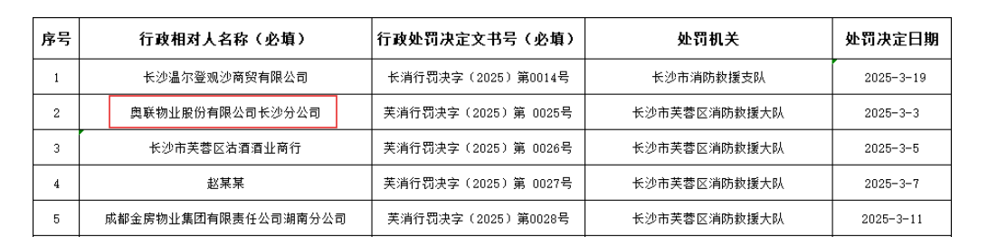 例如,2025年3月,长沙市消防救援支队发布行政处罚结果,奥联物业长沙分公司被点名。