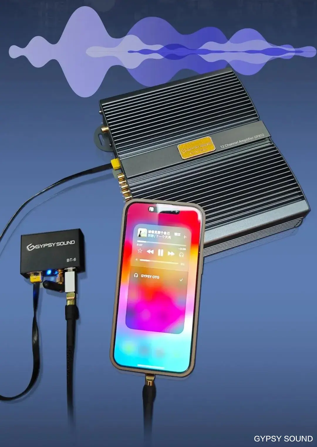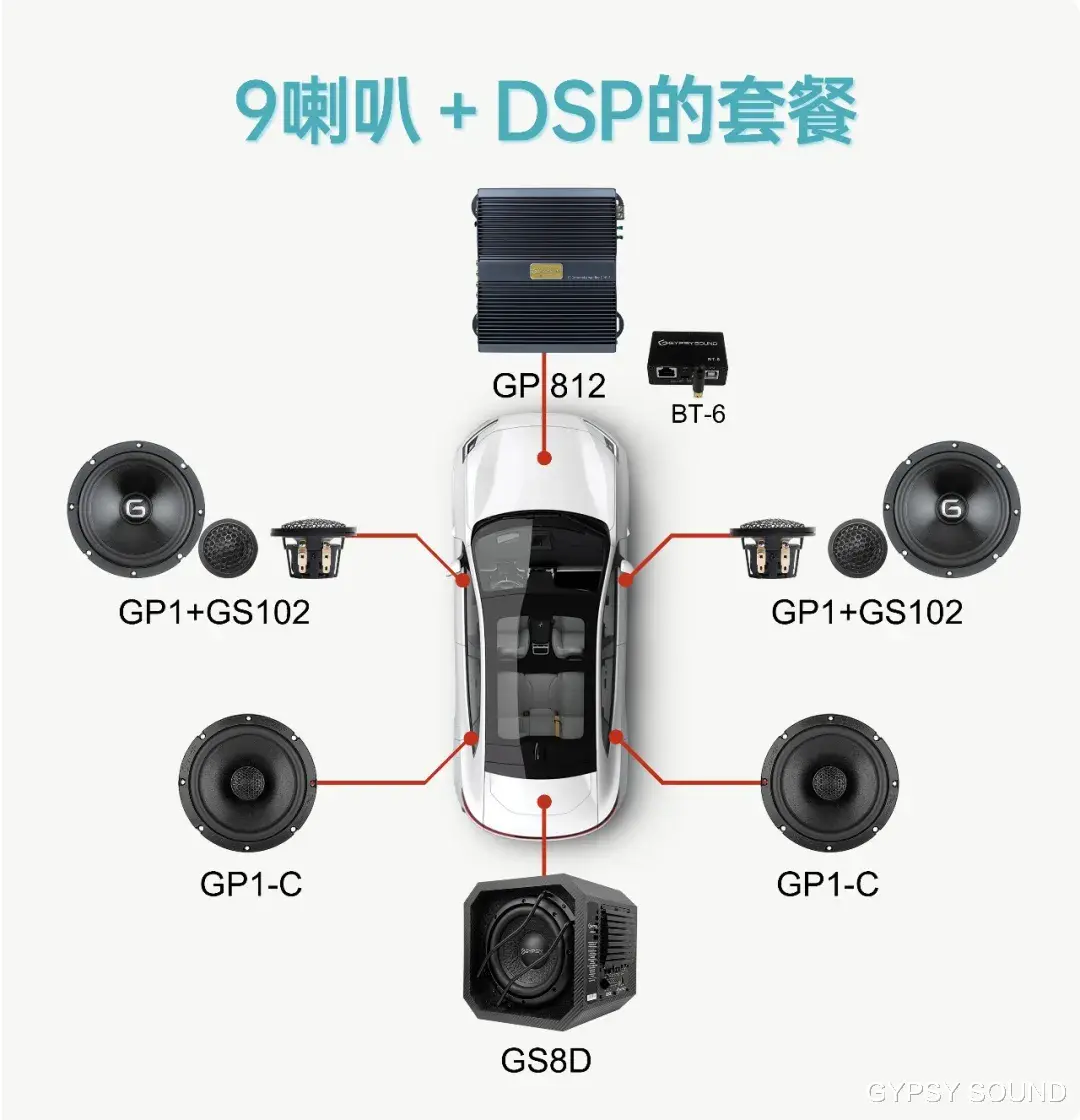 DSP功放是音响系统的 “大脑”,负责调节声音的各项参数,并对功率进行放大,以主动式驱动前后声场喇叭正常工作。本方案搭载GP812 DSP功放 + BT-6的OTG音源组合,性能强劲、功能全面。
