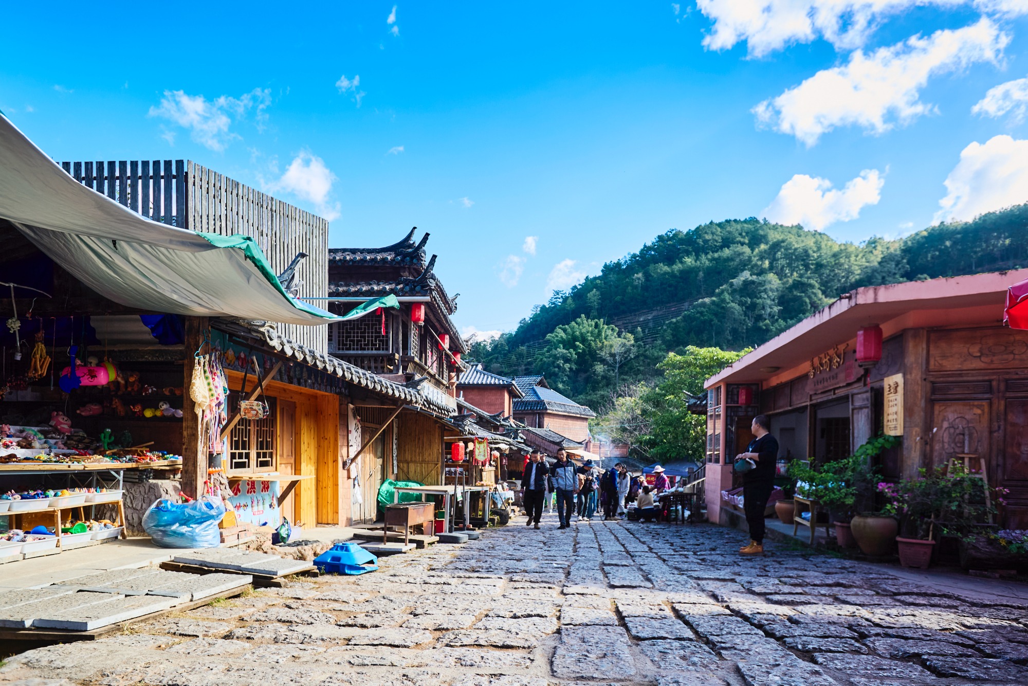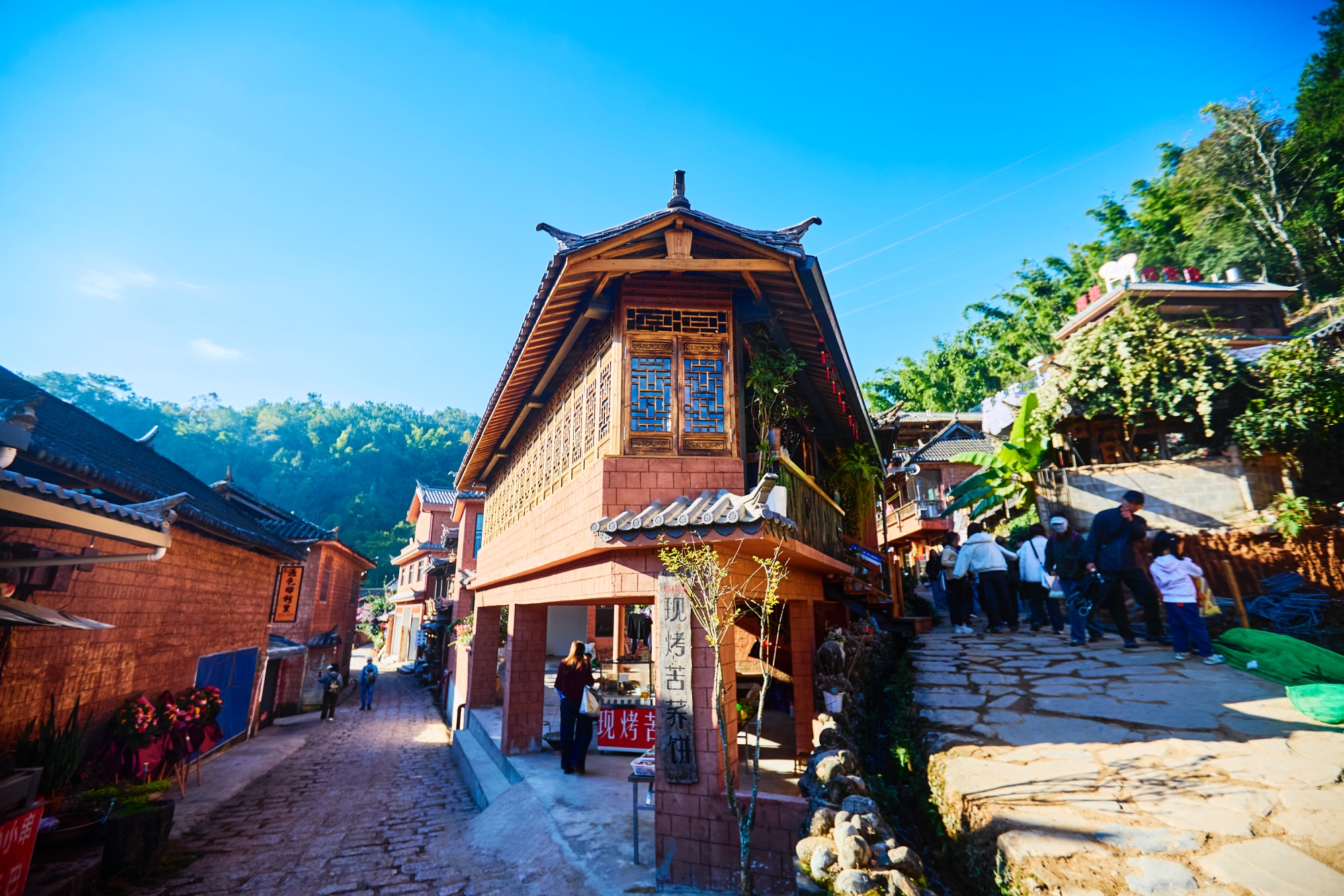 古街两侧是木质吊脚楼和夯土房,一侧的杂货铺摆着当地特色手工艺品,另一侧的小吃店飘着米干、烤豆腐的香气。青石板路一直延伸到不远处的山脚下,青山做背景,随意一定格就是复古感满满的滇南风情照。