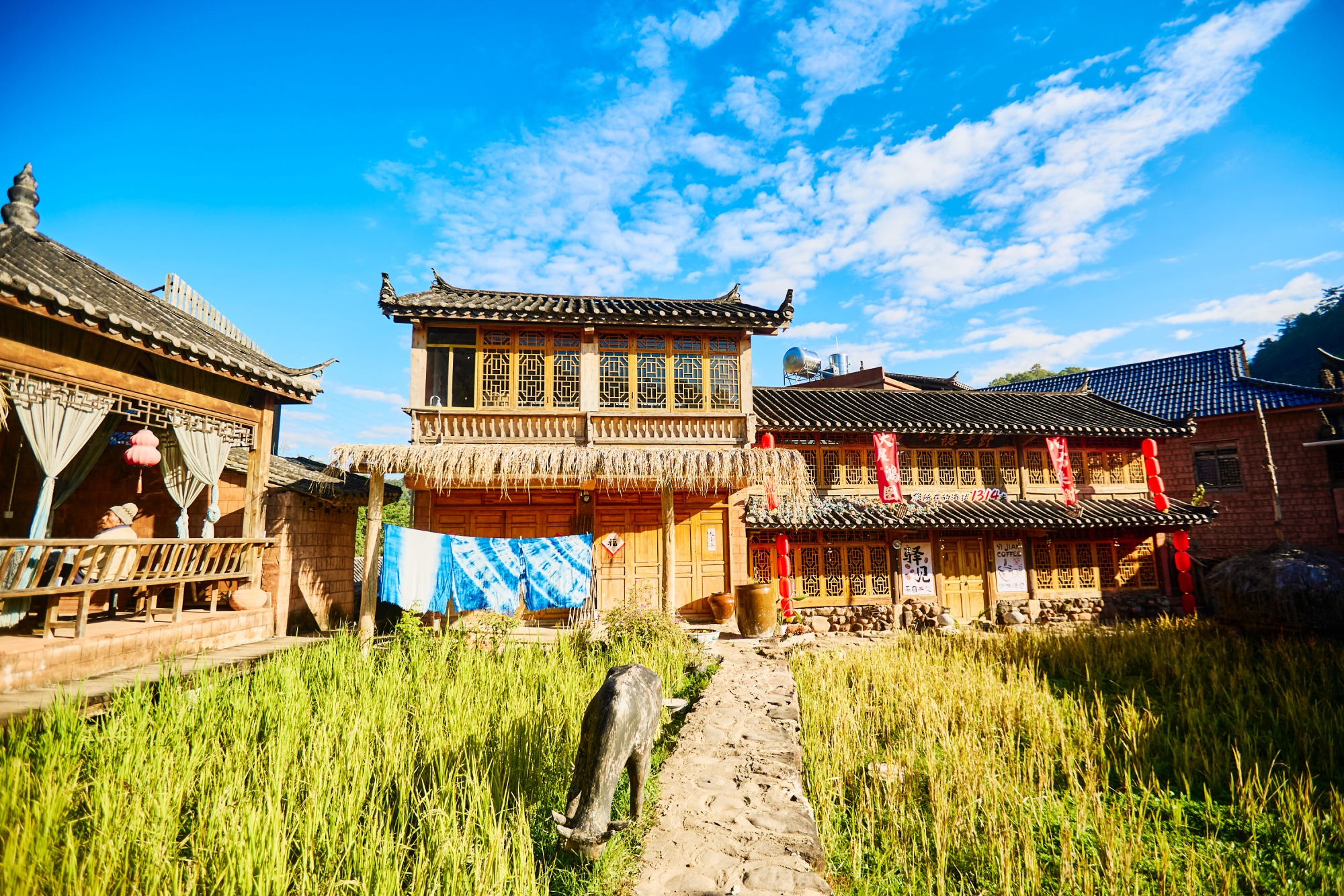 青葱田地间的小路直通二层木质小楼,小楼乌瓦覆顶,飞檐翘角,红灯笼、红帘招搭配檐下的蓝色扎染布,色彩丰富得好像一幅浓墨重彩的油画。