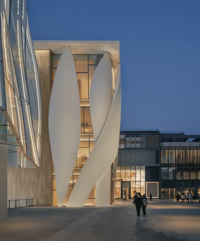 入夜后,建筑由内透出光晕,剪影如花般浮现于城市夜色中;白天,花瓣之间的空隙则成了取景框,将流动的街景片段定格其中,为都市一隅添上一抹静谧而诗意的注脚。