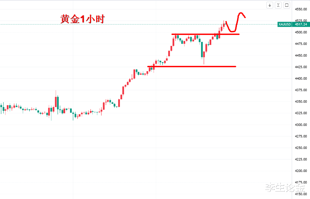 黄金多次上演“一脚油门一脚刹车”,尤其美盘后半夜空杀多异常激烈,金价成功站上4500美元历史性高点,上升过程伴随反复洗盘,昨晚后半夜4500美元快速跌到4430美元,这种快速的回抽高位追多有可能被一车带走。