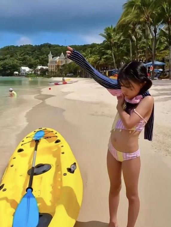 从陈展鹏夫妇后来的分享看来,这趟旅行简直乐趣无穷,尤其是小猪比,玩得那叫一个开心!这小家伙一眨眼就六岁了,个子长得跟竹子似的,在沙滩上玩得不亦乐乎,穿着粉黄相间的小泳衣,皮肤晒得有点黑,但五官还是挺精致的,估计是遗传了父母的好基因。