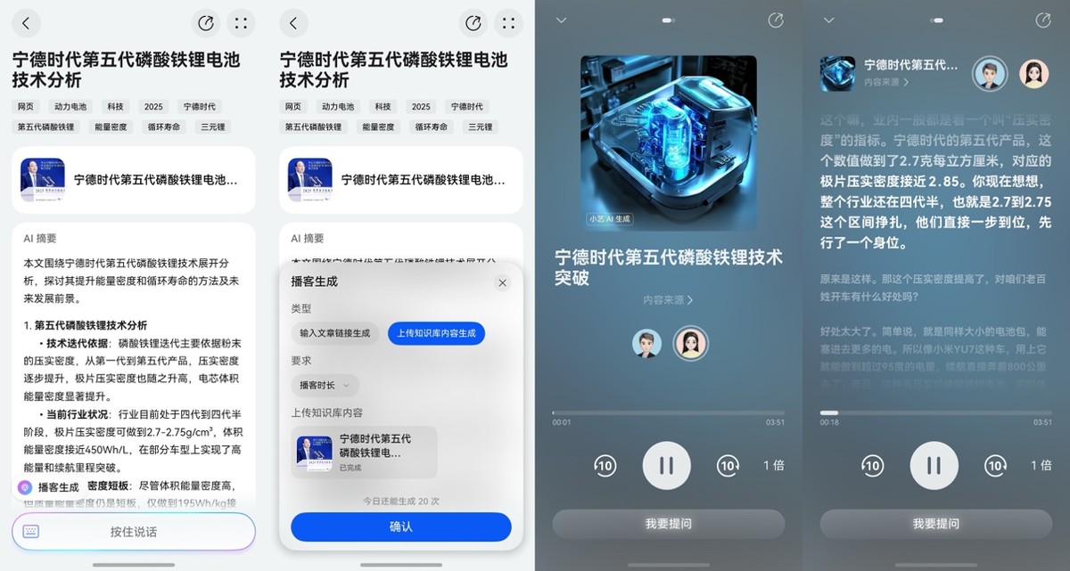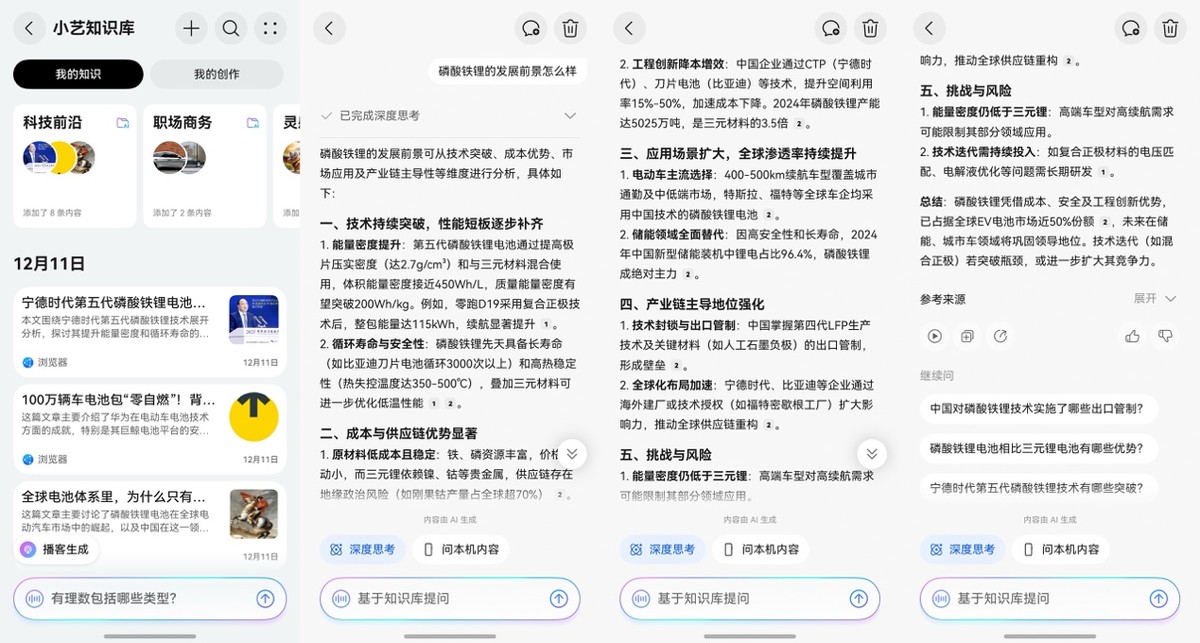 现在,我浏览到有价值的行业报告、数据图表或竞品动态,无论是网页还是PDF、视频,都一键拖拽或分享到小艺知识库。等到要写某个具体话题,比如“磷酸铁锂的发展前景怎么样”,我就可以直接让小艺基于我收藏的所有相关材料,提炼时间线、对比不同观点的差异,省时省力。