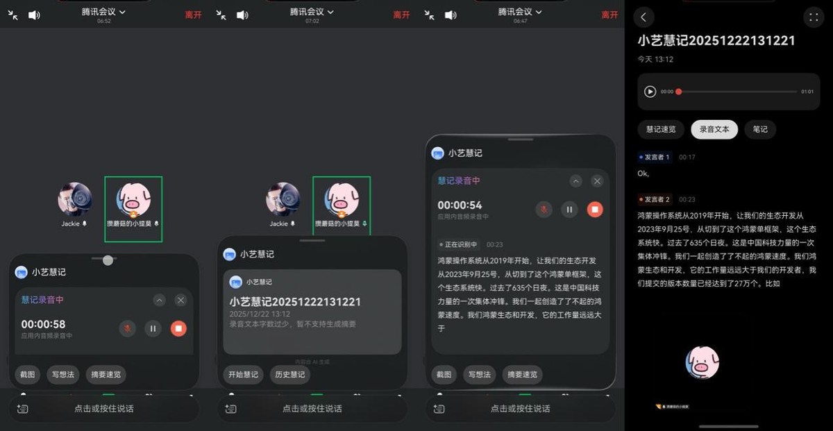 播客中,@图灵的猫还和老蒋提到了小艺慧记功能,前者用来整理会议纪要,后者则提到TA可以跨APP来实时转文字和会议总结。之前参加行业沙龙或进行专家沟通时,我需要集中精力思考与追问,很难同步做完整记录。现在遇到类似活动就能用小艺慧记功能,在通话或会议软件界面长按小艺导航条开启实时转写。会后稍作整理,核心内容就已经成型,这样大大减轻了我的回溯与整理压力。