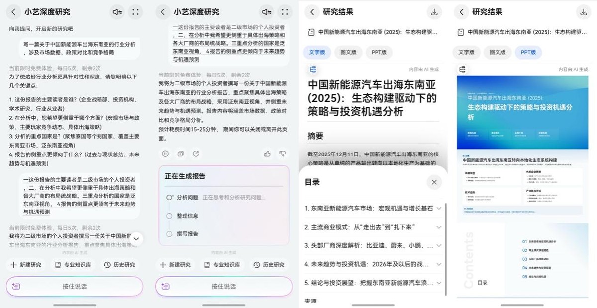 刚好我要写一篇“中国新能源车出海东南亚”的行业分析,索性把主题丢给小艺深度研究,不到二十分钟,TA就生成了一份结构清晰的报告,里面整理了东南亚主要国家的主流商业模式、国产汽车头部厂商的深度解析,还给出了未来趋势与投资机遇。虽然成稿还需我结合自己的判断进行深化和修正,但是已经极大地缩短了前期信息搜集和框架搭建的时间。