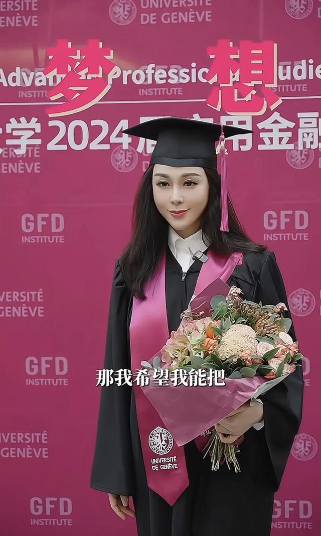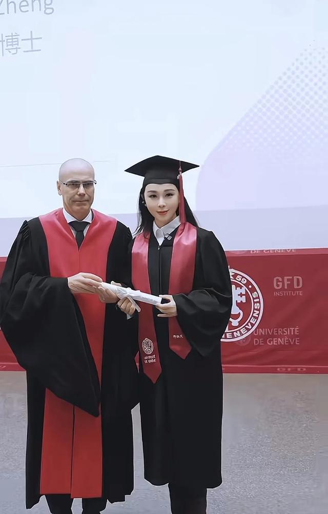 郑涵文顺利获得了日内瓦大学的金融博士学位,毕业了,她戴着博士帽,穿着博士服,与外国校长开心合影。