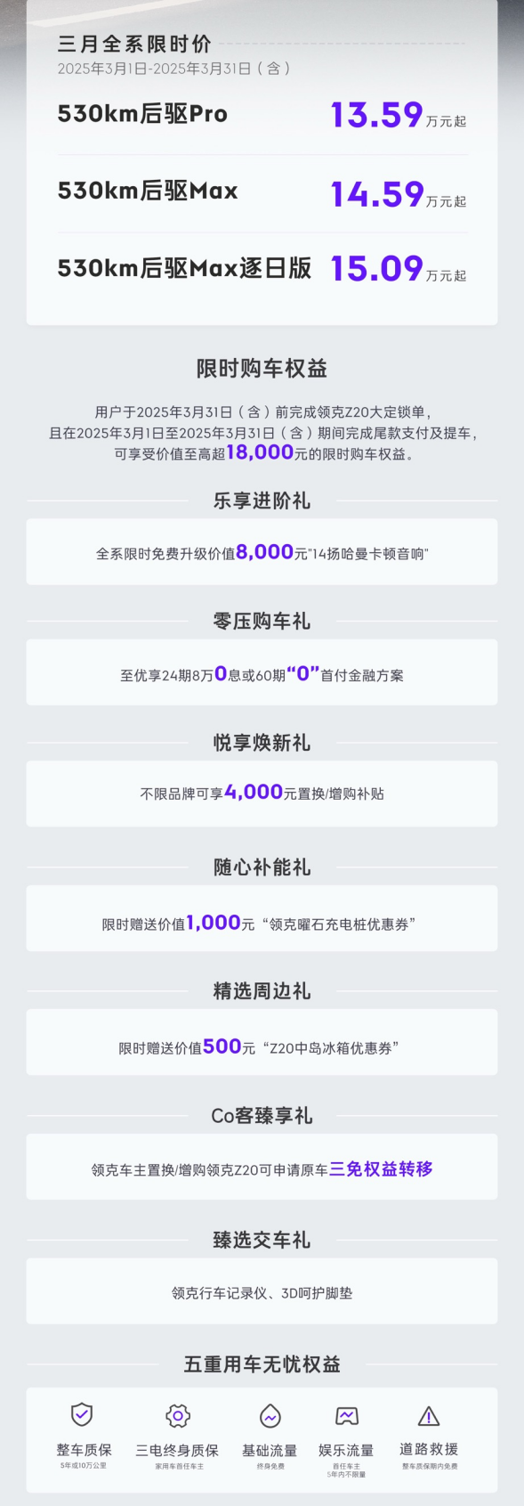 2025年3月1日至31日,针对领克Z20推出了力度空前的购车优惠。完成大定锁单并提车的用户,可享受价值超18,000元的权益。其中包括免费升级价值8,000元的14扬哈曼卡顿音响;可选择24期8万0息或60期“0”首付的金融方案;不限品牌均可享受4,000元置换/增购补贴;还能获得1,000元领克曜石充电桩优惠券以及500元z20中岛冰箱优惠券。领克车主置换/增购时,可转移原车三免权益,交车时还赠送领克行车记录仪与3D呵护脚垫。