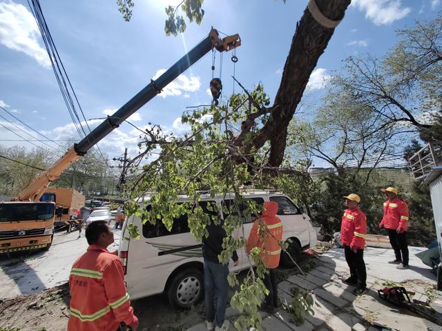 4月12日早上,石景山区苹果园街道边府社区城建四卫生院平房区发现树木倒伏情况。直径约60-70厘米的树枝被大风吹折。城建四物业巡查发现此情况后,上报给了边府社区,社区立刻联系苹果园街道安排应急队伍赴现场处置。