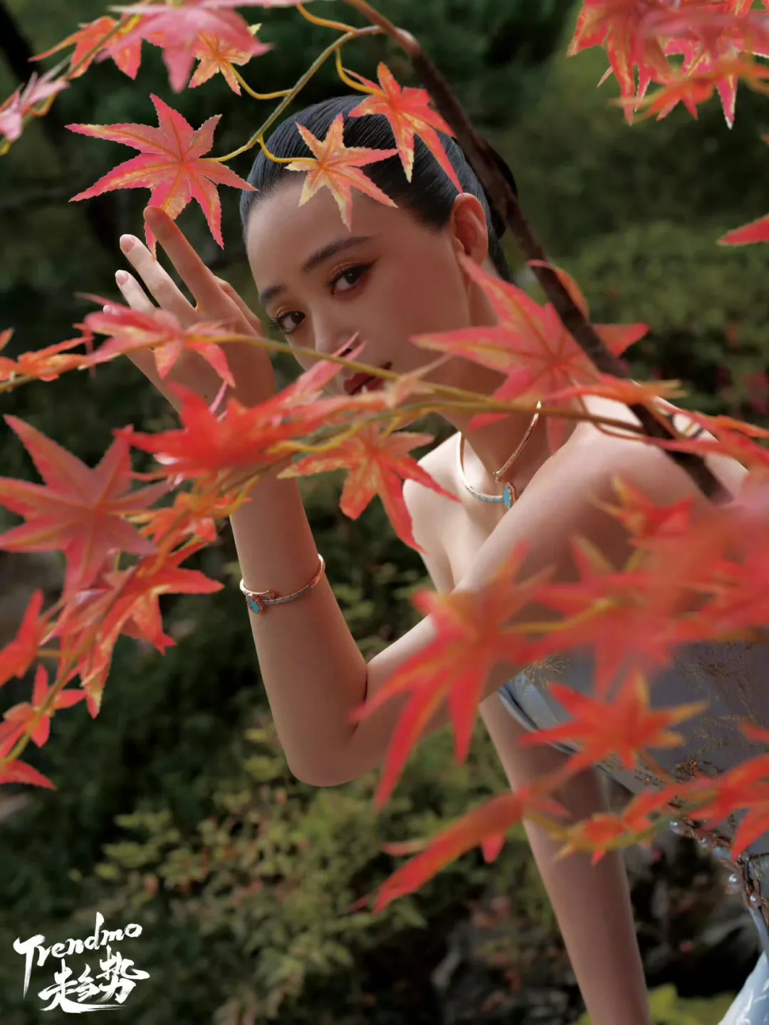庭院中,蒋欣半倚在栏杆上,抬手垂眸的模样更是娇艳欲滴,在满园枫叶的衬托下,蒋欣的温婉大气无一不彰显出大气磅礴的东方美。