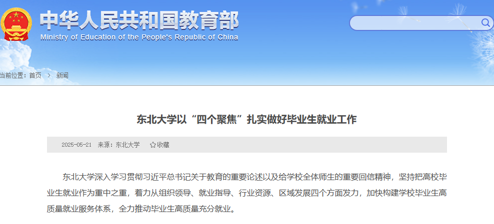 因此,高校就业指导的核心目标之一就是提升学生的“就业力”,即个体在就业市场中获得、维持和重新获得就业的能力。而且,为了全力推动毕业生高质量就业,教育部网站此前还报道了多个值得关注的范例,东北大学就是其中之一。