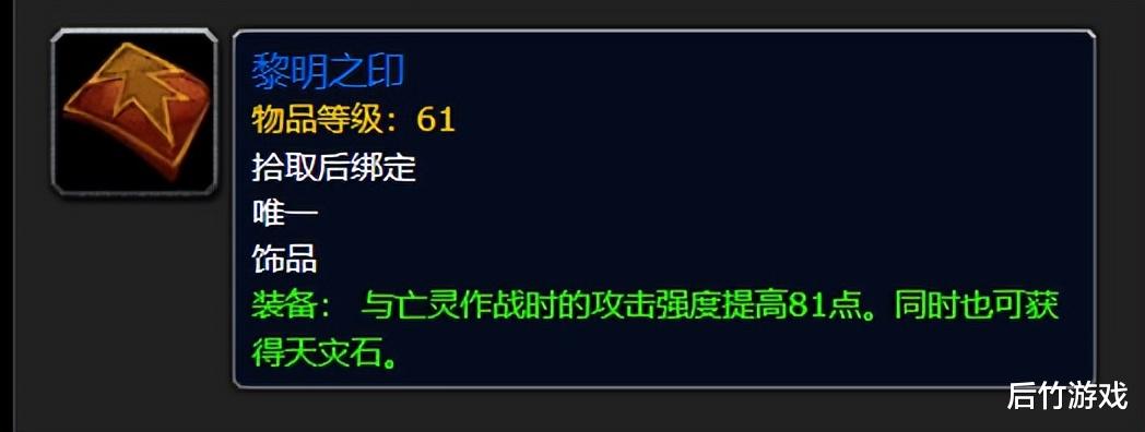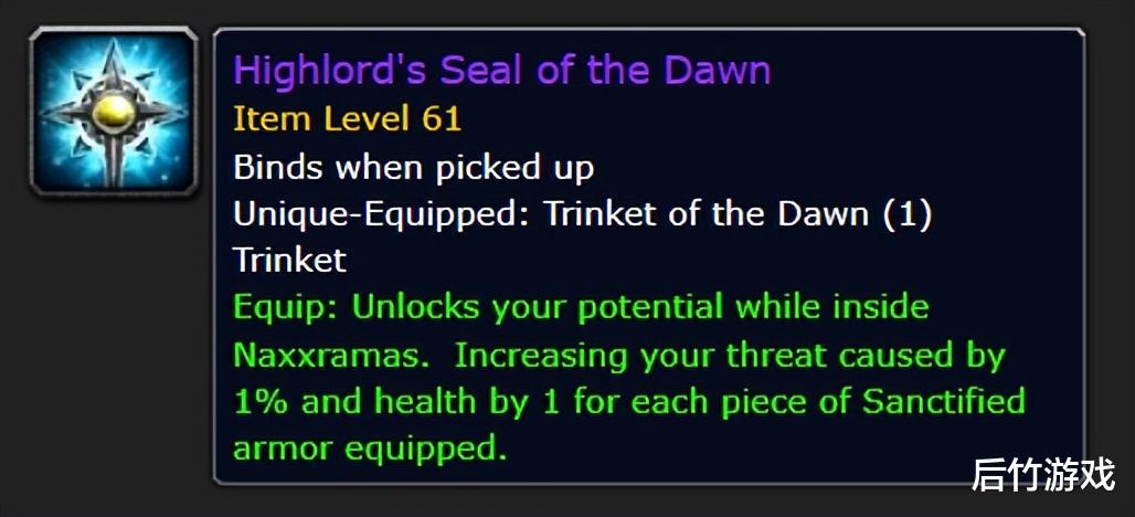 银色黎明声望饰品“黎明圣印”现在有4级(原版只能升级1次),品质从白色、绿色、蓝色到紫色,声望应该是从友善开始,并区分了不同的专精(坦克、治疗、DPS)。