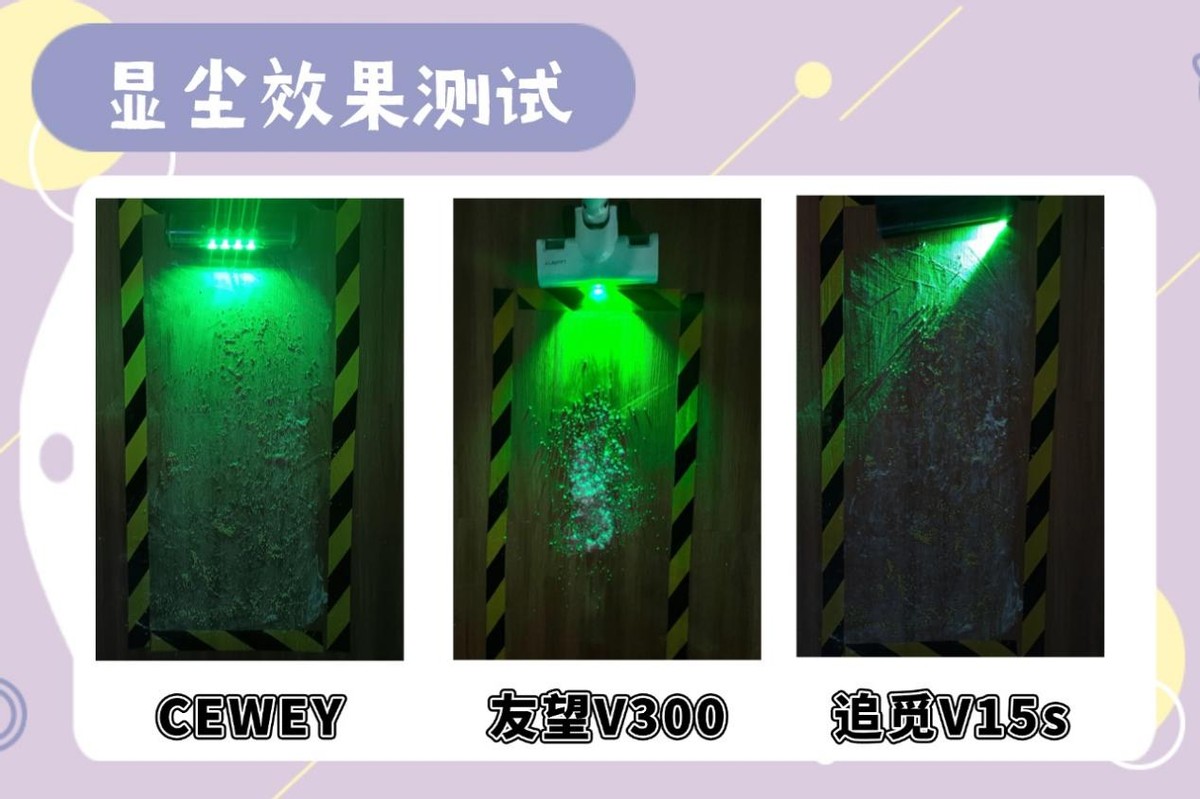 家用吸尘器十大排名榜怎么选?很多家庭打扫完之后总能看到漏吸得灰尘,有时候可能不是吸力不够大,而是看不清,不知道哪些地方还没有吸干净。所以本项测试主要是关注无线吸尘器在清洁可视化方面,所宣传的绿光显尘灯是否实用有效,观察它们在同一暗光线环境下,在相同灰尘颗粒量级下,三款无线吸尘器显尘的效果表现。