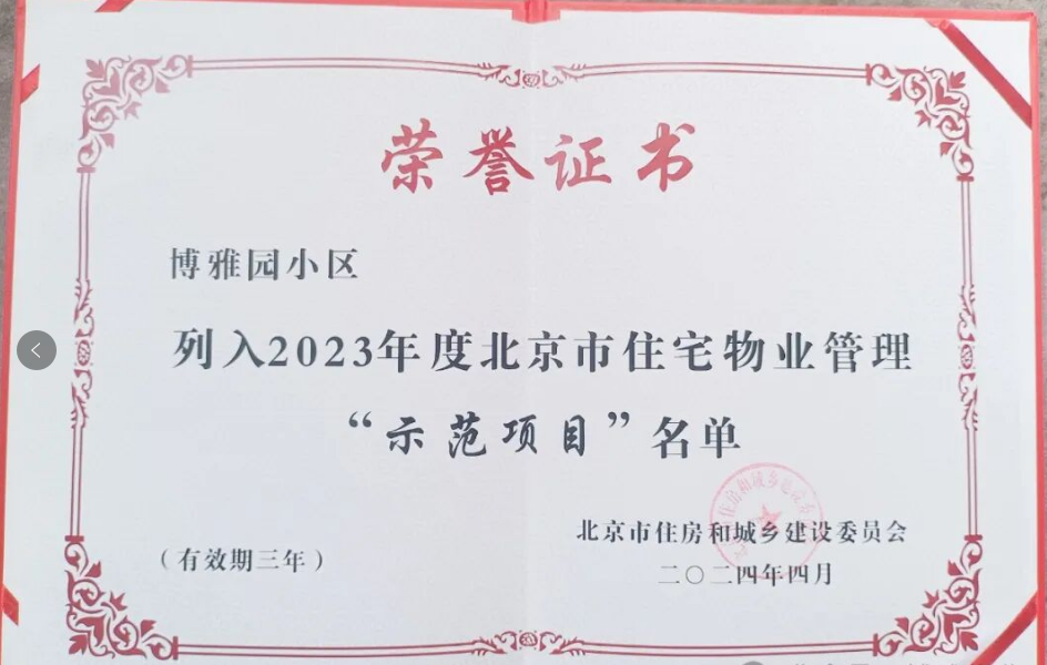 2024年7月18日,由朝阳区房管局颁发“北京市住宅物业管理示范项目”荣誉牌和荣誉证书,7月24日在麦园社区崔骏书记、李鑫淼老师和博雅园业委会主任赵惠主任的见证下,为“北京市住宅物业管理示范项目”博雅园项目进行挂牌。