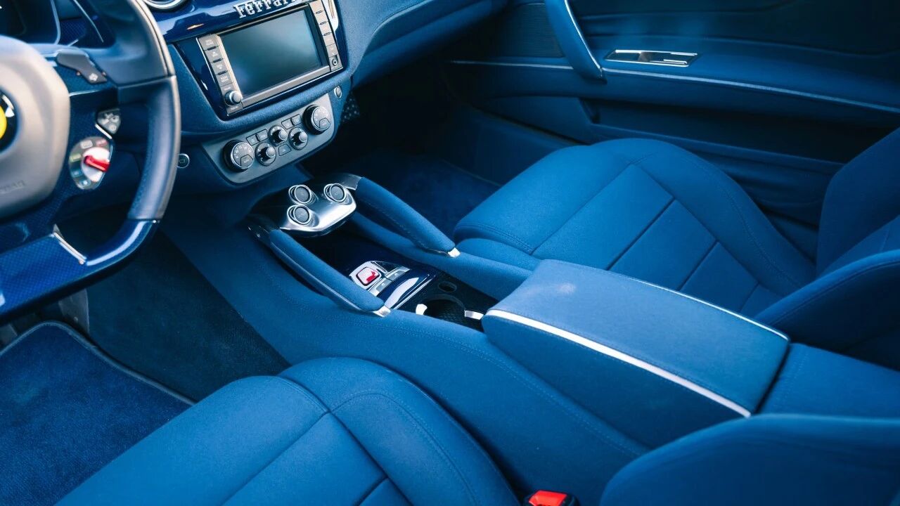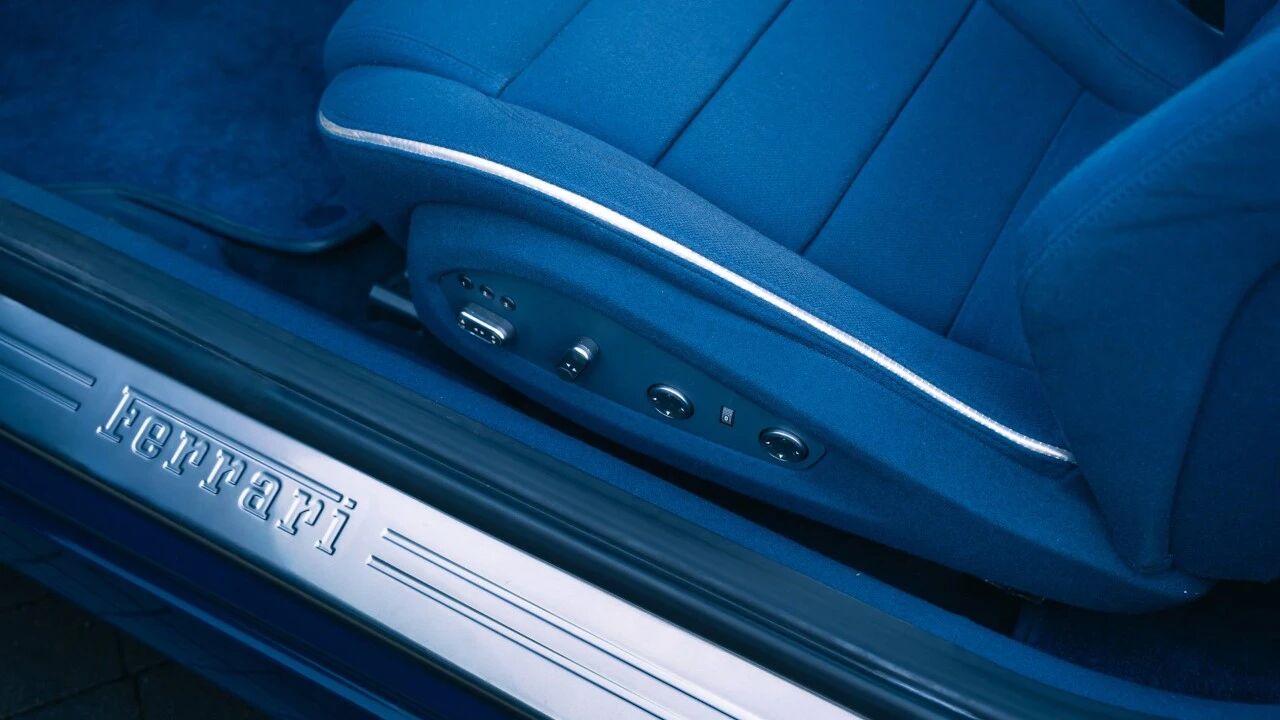 不同于多数法拉利车主偏爱真皮内饰的奢华,他独辟蹊径选择了蓝色织物座椅,这一配置在现代法拉利车型中堪称凤毛麟角,柔软的织物触感既保留了意式复古韵味,又带来了真皮难以比拟的透气舒适,与“新蓝色”车身形成完美呼应,打造出独一无二的“蓝魂”配色方案。