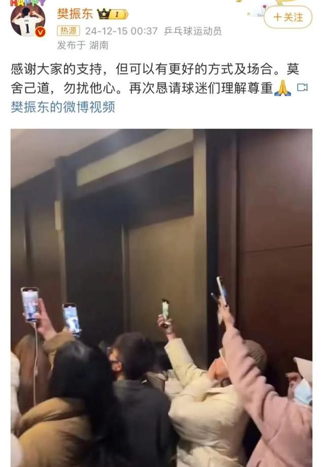 12月15日凌晨,樊振东在社交媒体上发布了一段视频,配文“感谢大家的支持,但可以有更好的方式及场合。莫舍己道,勿扰他心。再次恳请球迷们理解尊重”。