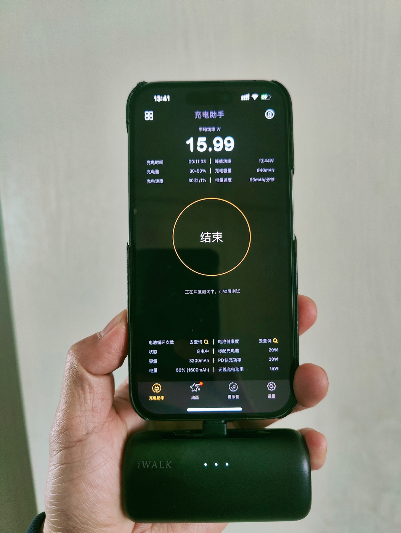 充电宝支持15W的输出,比市面上的共享充电宝可是要快上很多。我的手机上充电10多分钟的平均功率实测达到了15.99W,iWALK爱沃可的标注,可以说是实打实了。初始电量为35%开始充电,大概半小时后的电量就能达到60%,速度方面,我还是很满意的。