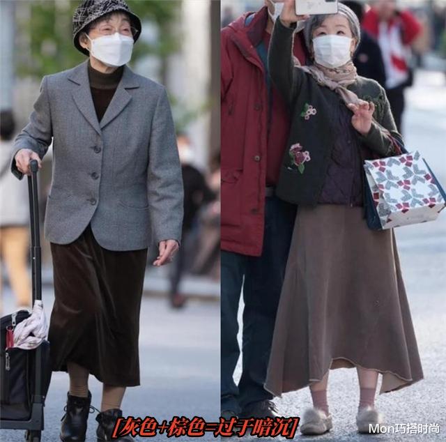 也有一些中年女人不敢穿太花哨的衣服,于是就转战这种暗沉色的老年装,灰色的外套,深棕色的裙子,再配一件深色的打底衫,全身包裹得超级严实,给人一种很浓的压抑感,直接把自己的年龄写在脸上,这样的打扮不显老才怪呢。