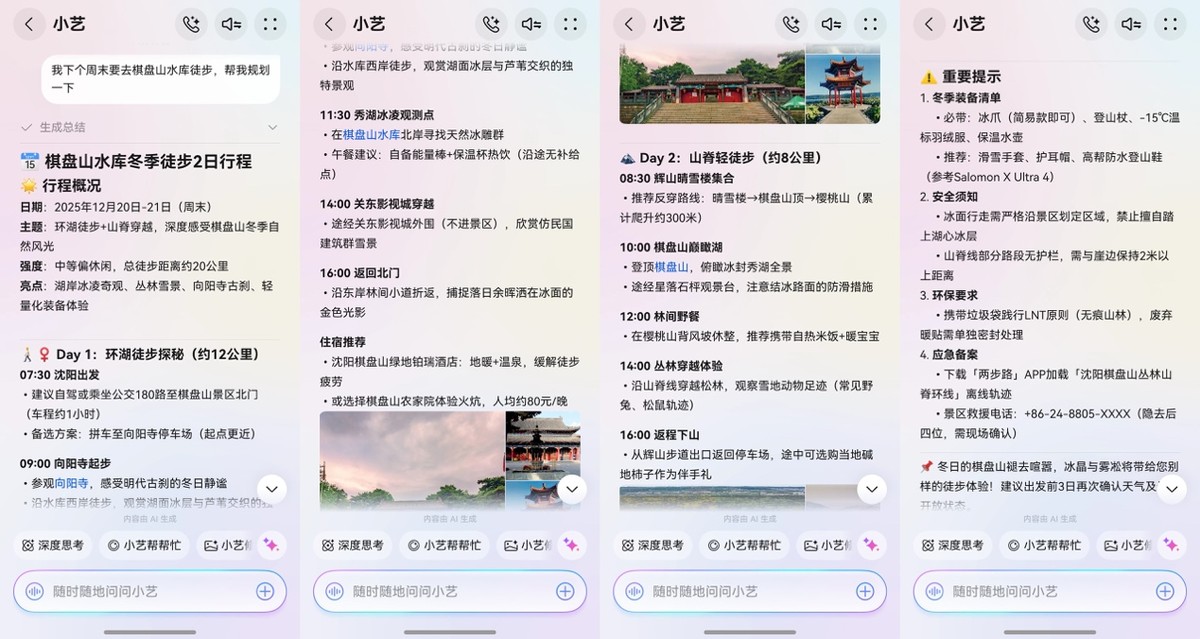 博主说她用小艺规划了周末露营的全流程,我也跟着试了下:直接对小艺说:“我下周末要去棋盘山水库的徒步,帮我规划一下。”没想到,TA真的给我做了个超级详细的徒步计划,从步行路线到时间安排,从冬季装备到应急备案,整个过程就像有个经验丰富的老手在带我。以前做攻略,我得在好几个App之间来回切换,查天气、列清单、找路线,头都大了。现在有了小艺,以后我再出去玩,就可以把准备工作交给TA,我就能偷个懒了!