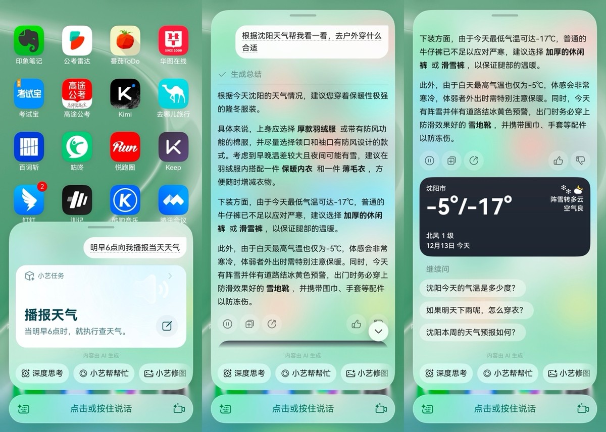 现在我算是彻底“赖”上小艺了。晚上睡前,对着小艺说“明早六点向我播报当天天气”,TA就能准时开启外放播报天气概况。当我对着衣柜发呆不知道穿什么时,我也会问一句“根据沈阳天气帮我看一看,去户外穿什么合适?”小艺也能给出非常详细的搭配建议。