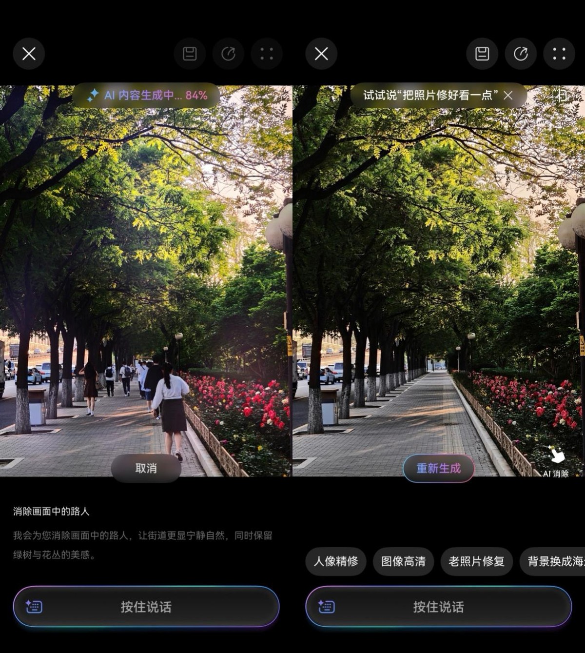 “高能生活家”在博文中还提到了小艺修图的一系列功能。我也赶紧试了试,在相册里找一张废片,对着小艺说“消除多余的路人”,画面瞬间就干净了,连后面的绿树和花丛纹理都补得天衣无缝,原本平平无奇的风景一下子变成了风光大片,这太惊艳了。发朋友圈好几个人问我哪里拍的,用了什么修图软件,那我的回复必须是:小艺!