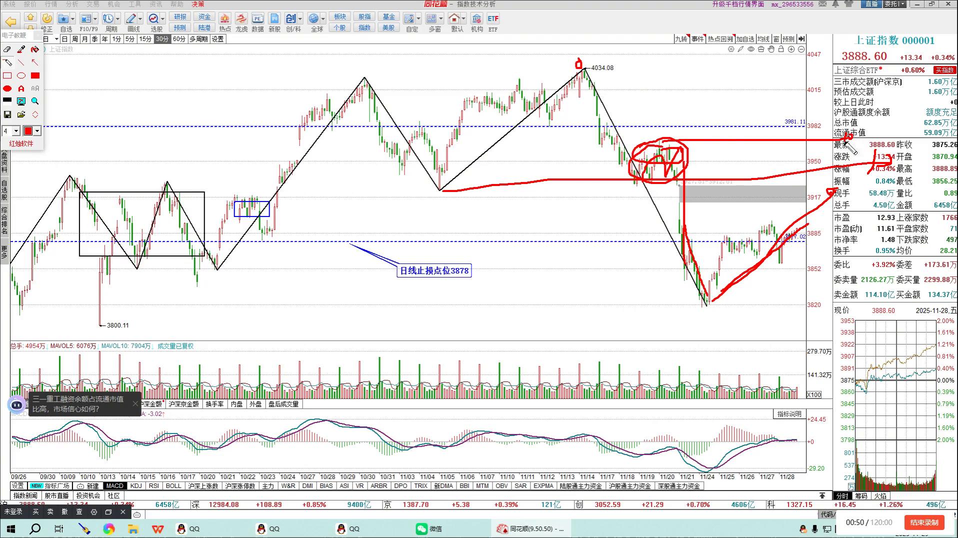 如果能过掉中枢,判断日线结构是一笔下跌结构就是错误的,过不了就代表了判断没有问题,也就是上证指数这一笔向上最高的、最大的一个空间,我认为基本上就是在三九六五到三九八幺这个位置附近。