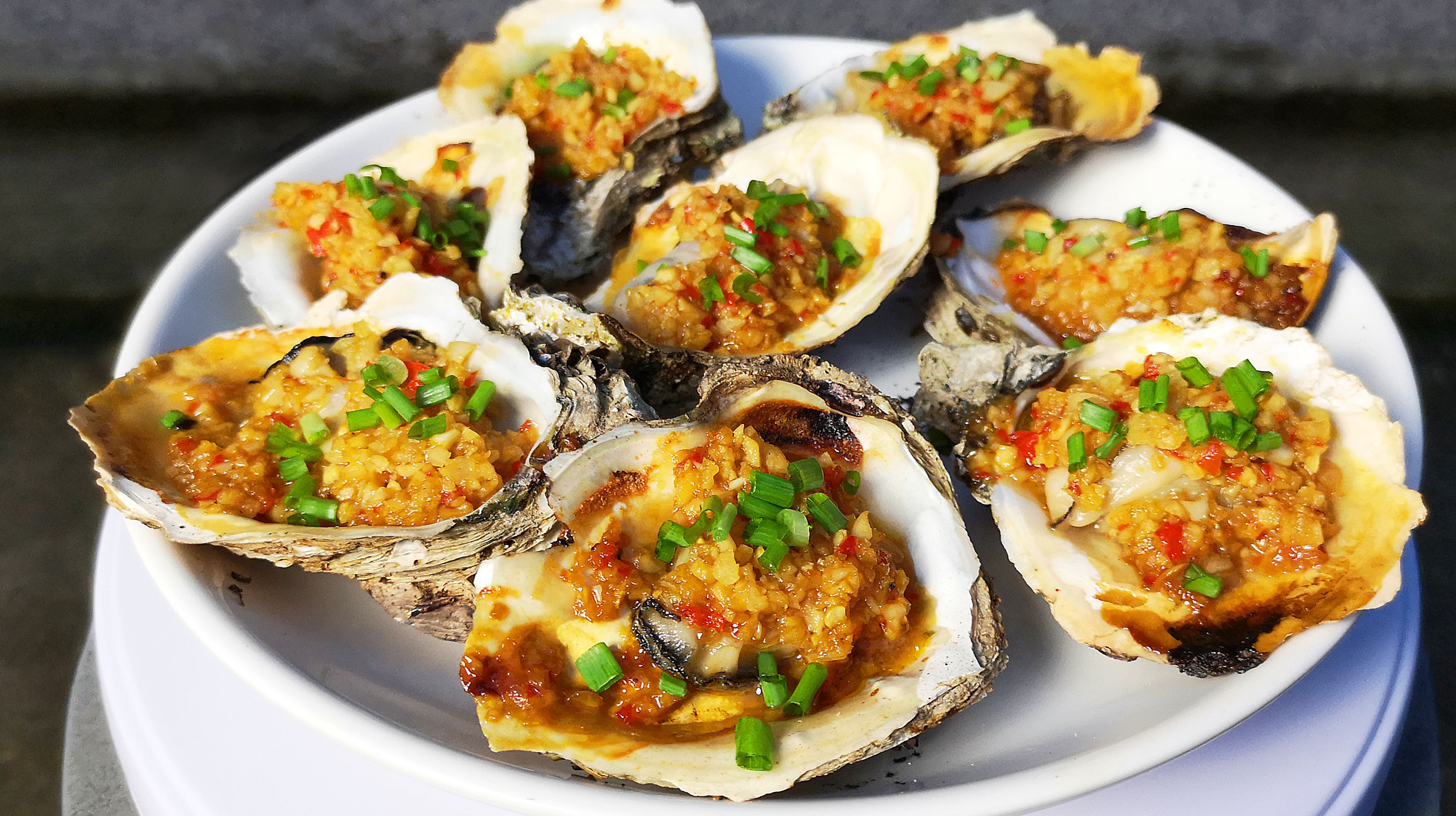 大蚝是钦州最骄傲的海鲜名片。钦州湾水质优良,浮游生物丰富,出产的大蚝个头硕大,蚝肉肥满,口感鲜甜。大蚝的吃法多种多样——最经典的是蒜蓉烤大蚝,将鲜活大蚝撬开,放上蒜蓉、辣椒、粉丝,炭火烤至汁水沸腾,蚝肉嫩滑,蒜香浓郁。