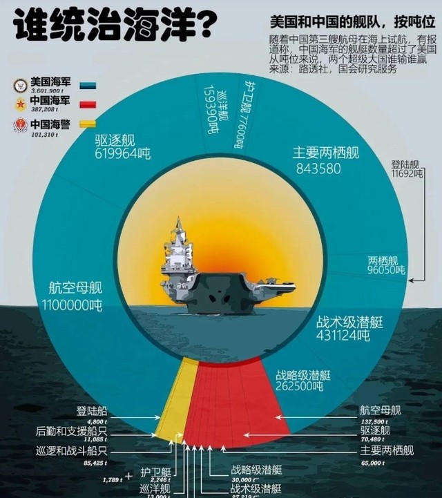从一些数据当中可以看到现在海军的舰艇上面,美国有着一定的地位排在第一位,以730万吨的数据和中国拉开差距,中国在数据上面是有289万吨,在数据上面看中国也不是美国报告当中的“世界第一”,不过这也是一项数据的对比,中国在发展上面是全方位的。