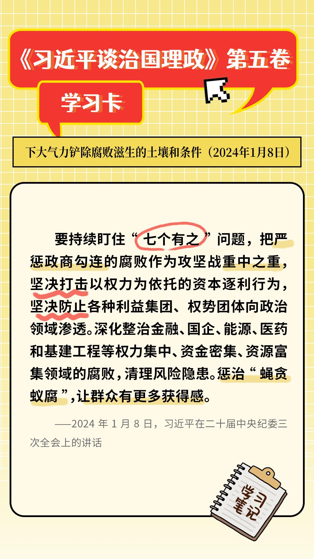 下大气力铲除腐败滋生的土壤和条件,是《习近平谈治国理政》第五卷深入论述的开展反腐败斗争的根本之道。持续保持惩治腐败高压态势,盯住“七个有之”问题、高悬惩治利剑,更是我们持续发力、纵深推进反腐败斗争的关键战略部署。那么“七个有之”具体指的是什么问题呢?一起来了解。